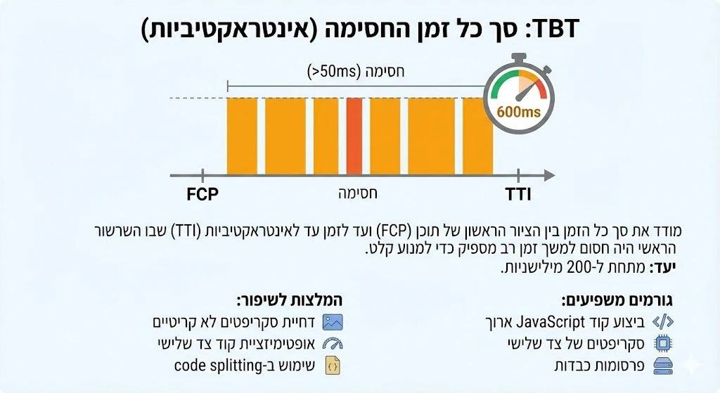 - הערה: במבחני מעבדה (כמו PageSpeed Insights) FID מוחלף לרוב ב-Total Blocking Time (TBT) המודד כמה זמן הראשי של הדפדפן נחסם על ידי סקריפטים.