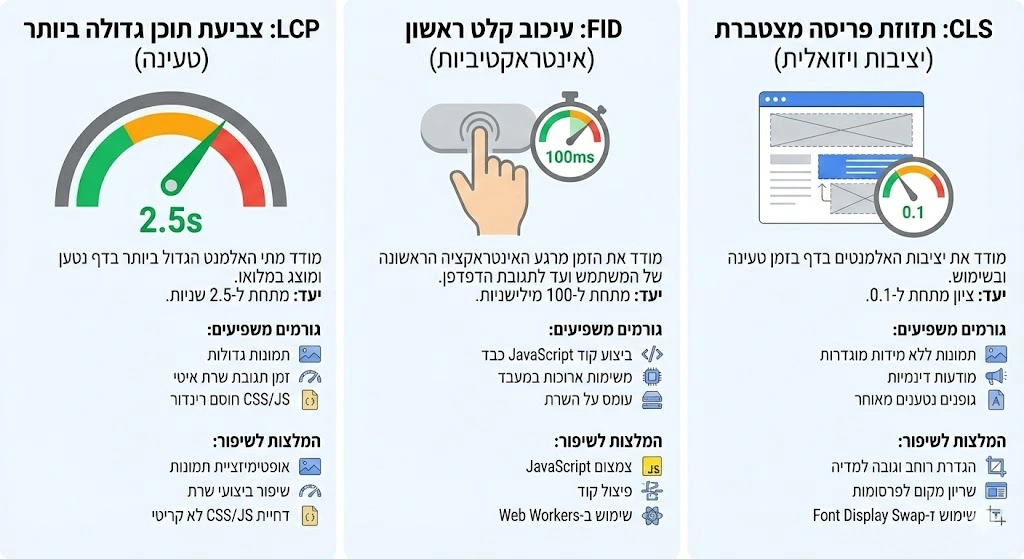 - Cumulative Layout Shift (CLS): מודד את היציבות הוויזואלית של העמוד. במילים פשוטות, האם אלמנטים בעמוד “קופצים” או משנים את מיקומם בזמן הטעינה, מה שעלול לגרום למשתמש ללחוץ על משהו בטעות. ציון טוב הוא פחות מ-0.1.